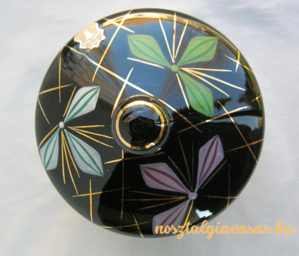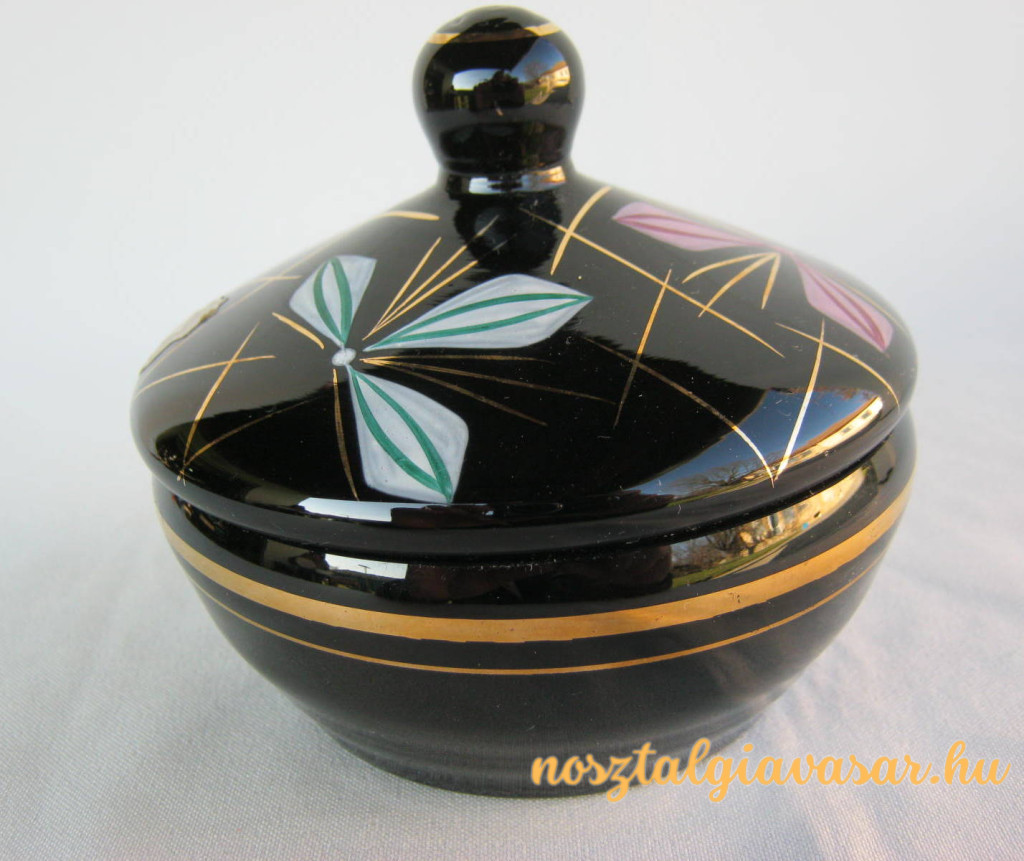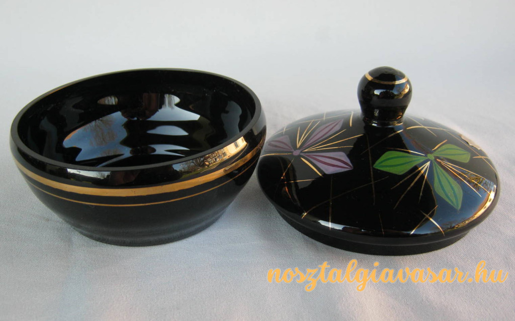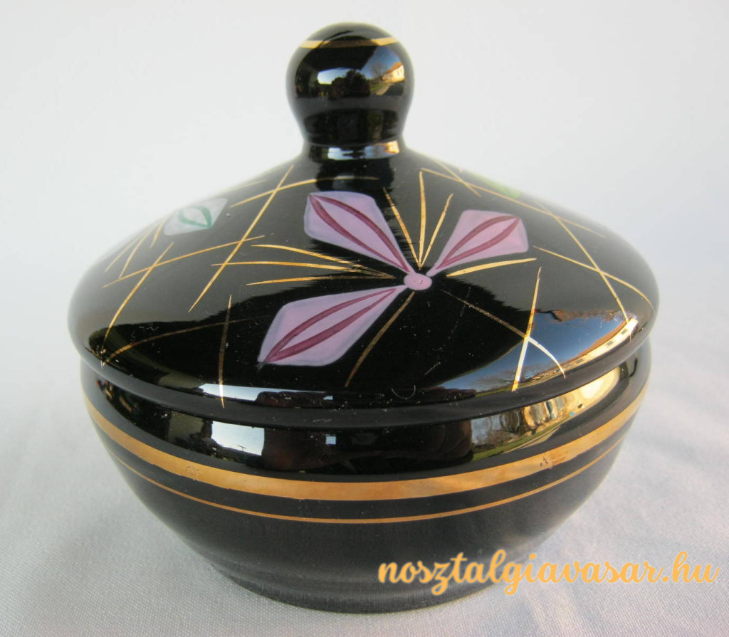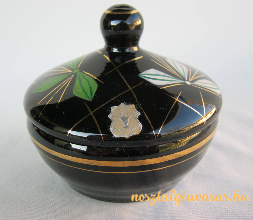 Retro színes mintákkal díszített fekete üveg bonbonier