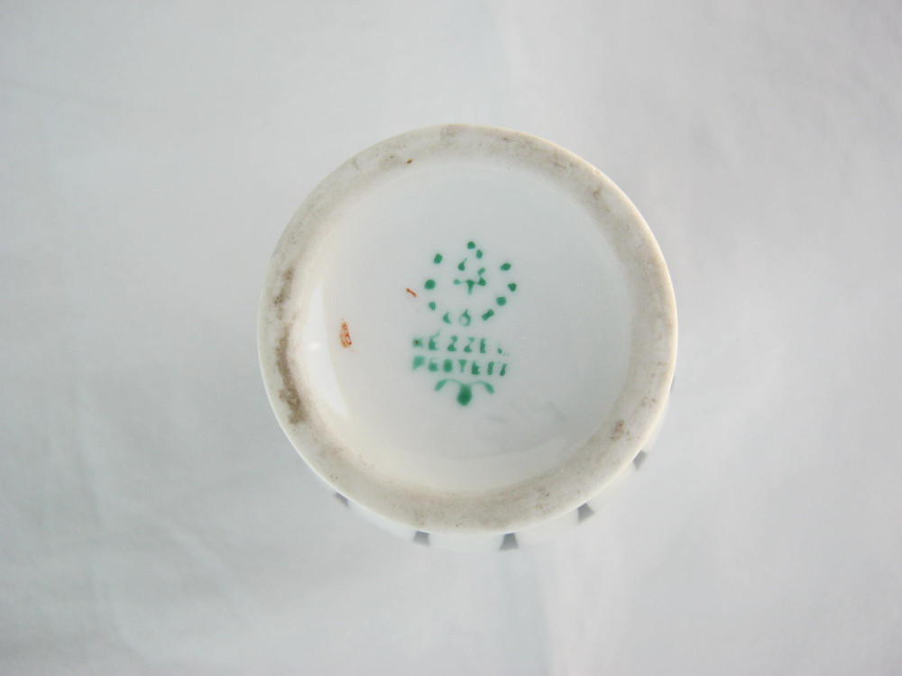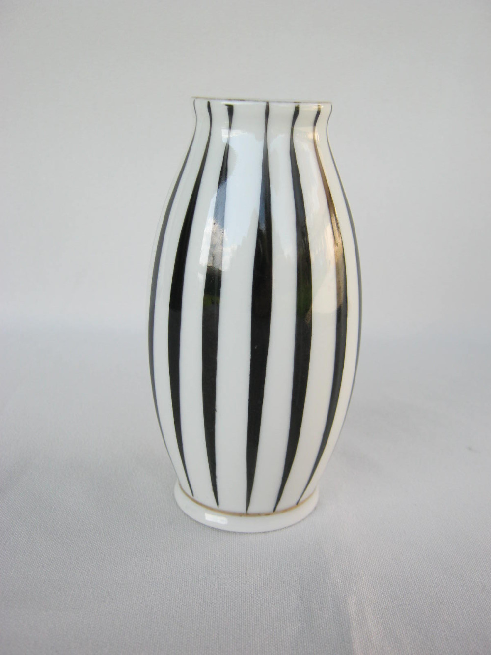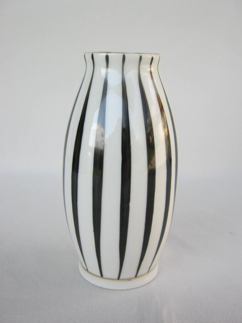 Kézzel festett retró Hollóházi porcelán fekete-fehér csíkos váza.