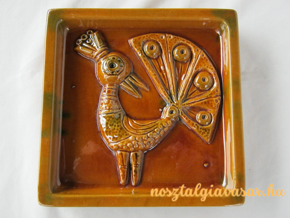 Retro mázas kerámia pávát ábrázoló fali dísz