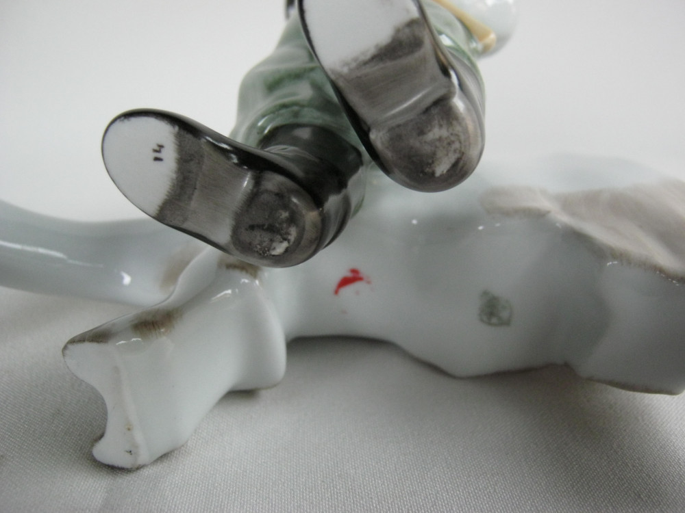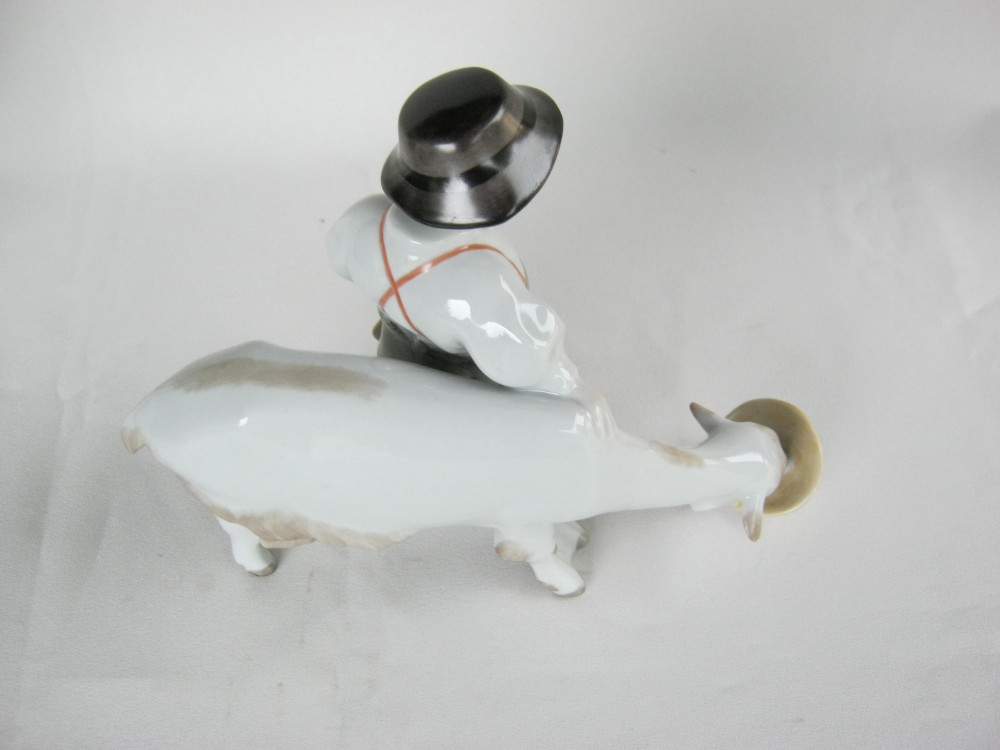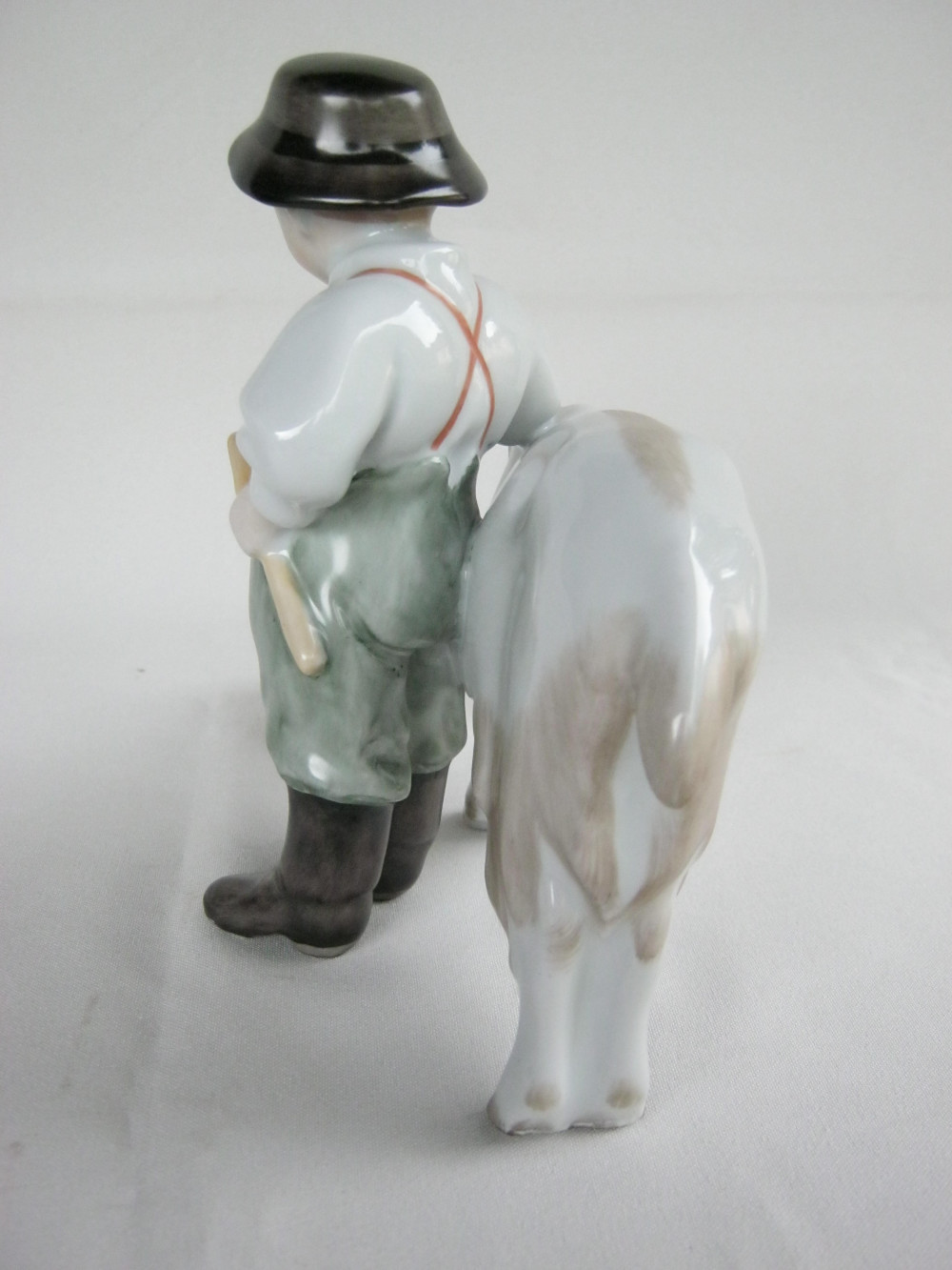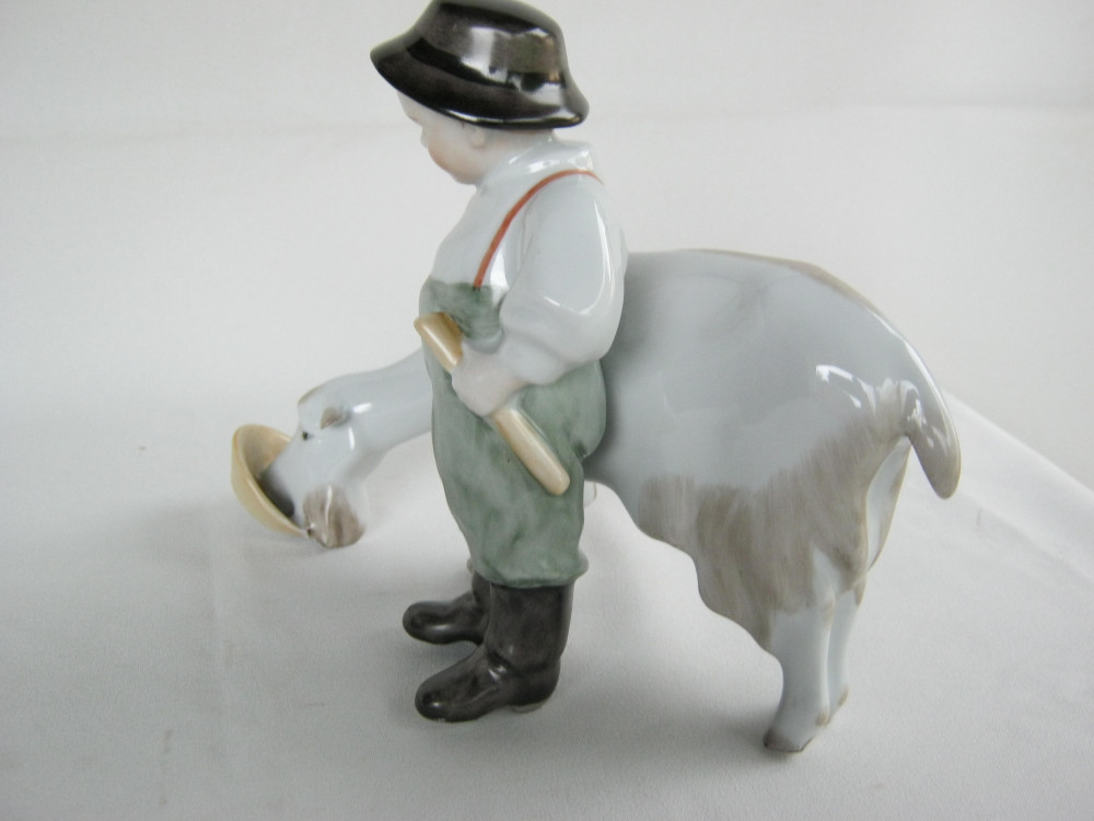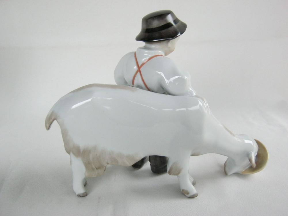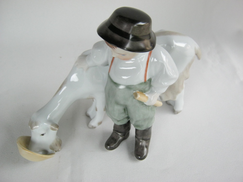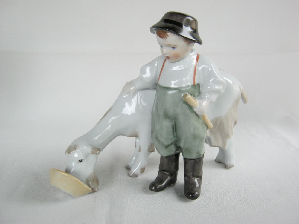 Kézzel festett retró Zsolnay porcelán kecskét etető kisfiú.