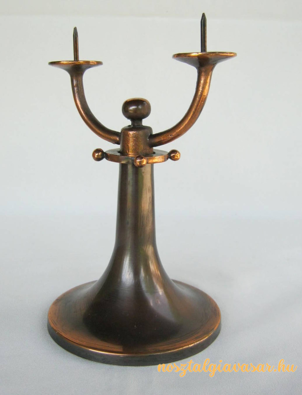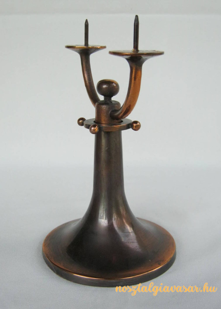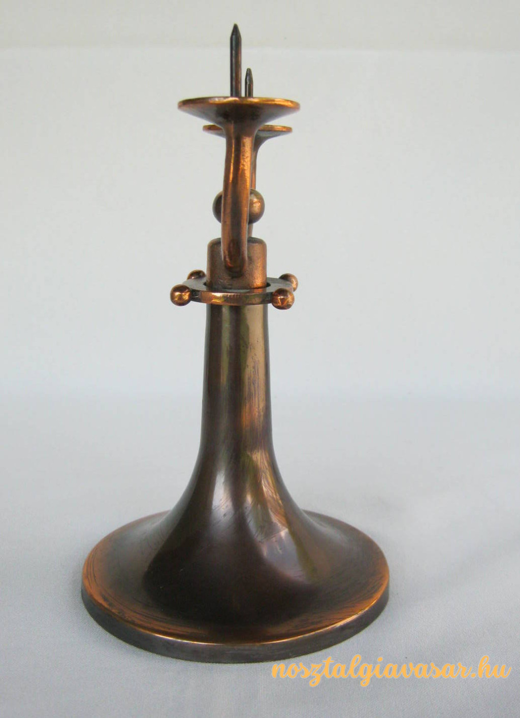 Retro iparművészeti rézötvözet gyertyatartó Méret: magasság 18 cm Jelzés: nincs Állapot: kopások, karcok láthatók rajta, képek szerint Rendelhető mennyiség: 1 db