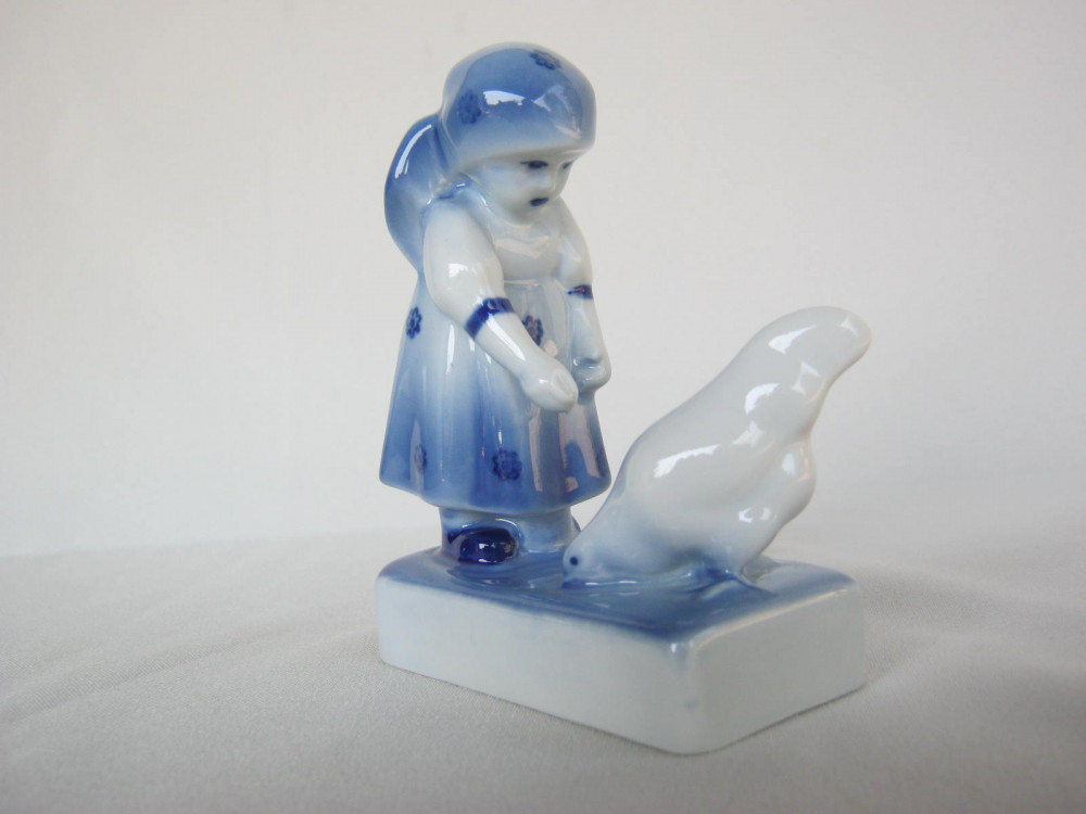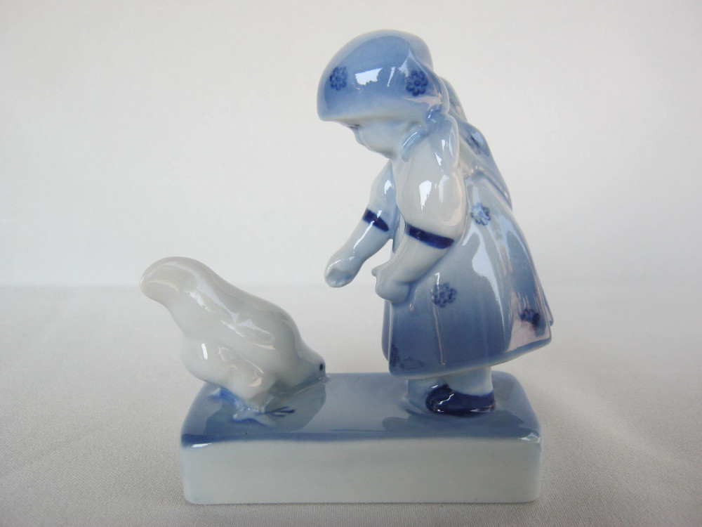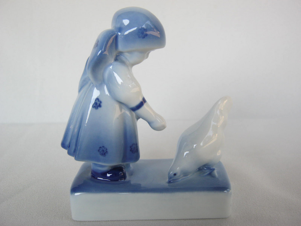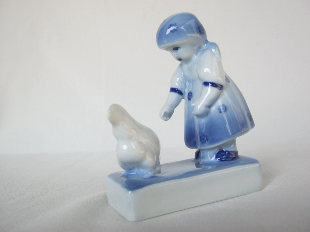 Kézzel festett retró Zsolnay porcelán tyúkot etető kislány figura.