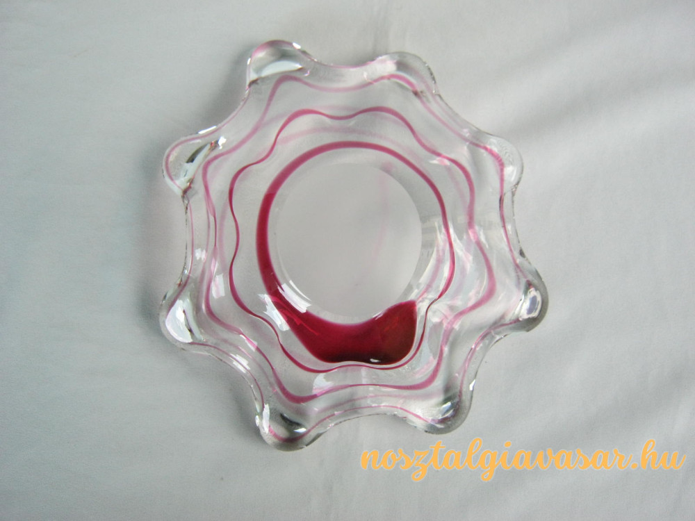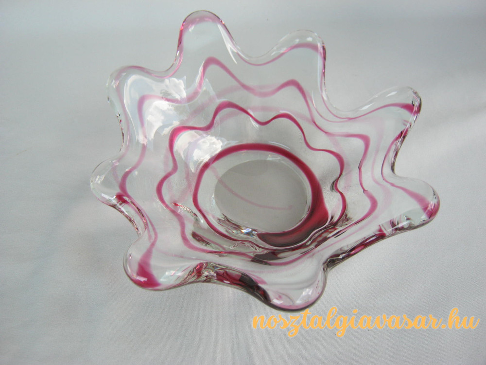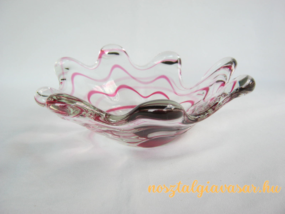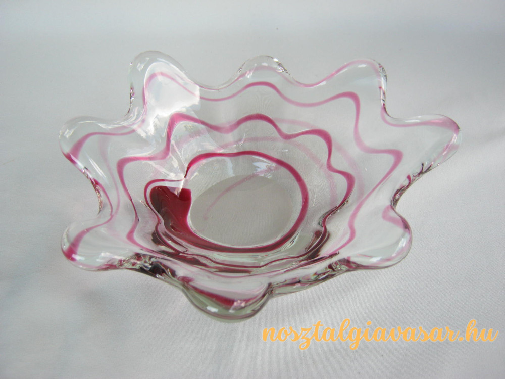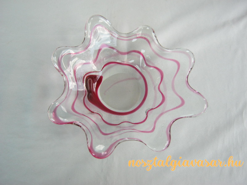 Vastag üveg fodros szélű tál rózsaszín folyatott díszítéssel Jelzés: nincs Magasság: 8 cm Szélesség: 22-24 cm Súly: 1200 gr Állapota: képek szerinti, korának megfelelő Rendelhető mennyiség: 1 db