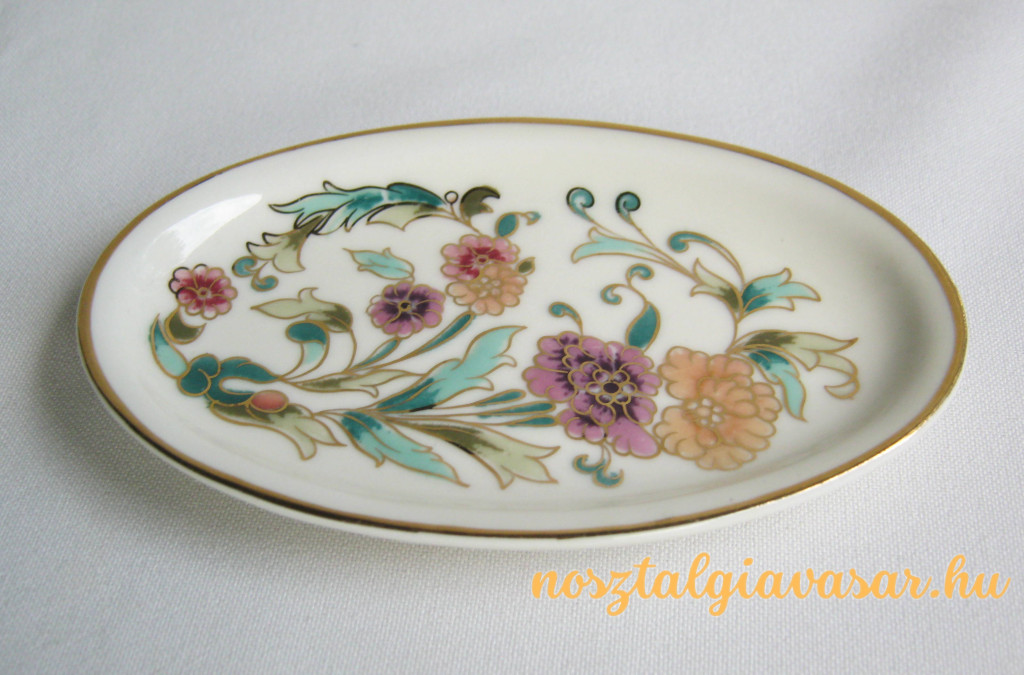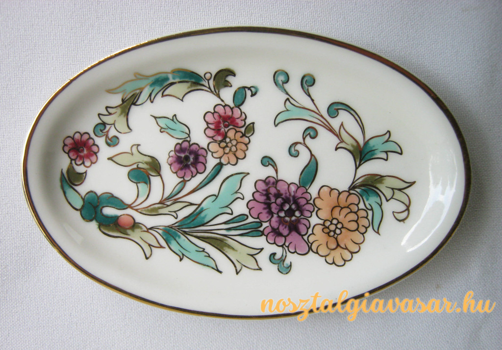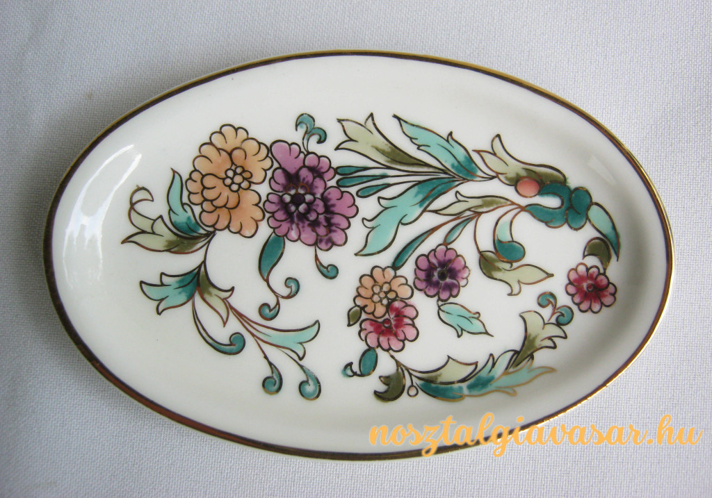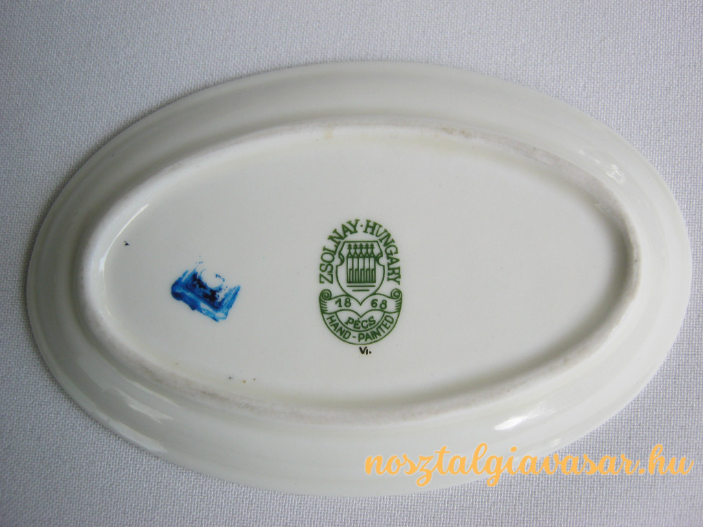 Kézzel festett porcelán virágmintás tálka Gyártó/készítő: Zsolnay Porcelángyár Jelzés: alján zöld pecsét Méret: hossz 11 cm, szélesség 7 cm Állapot: korának megfelelő, képek szerint Rendelhető mennyiség: 1 db