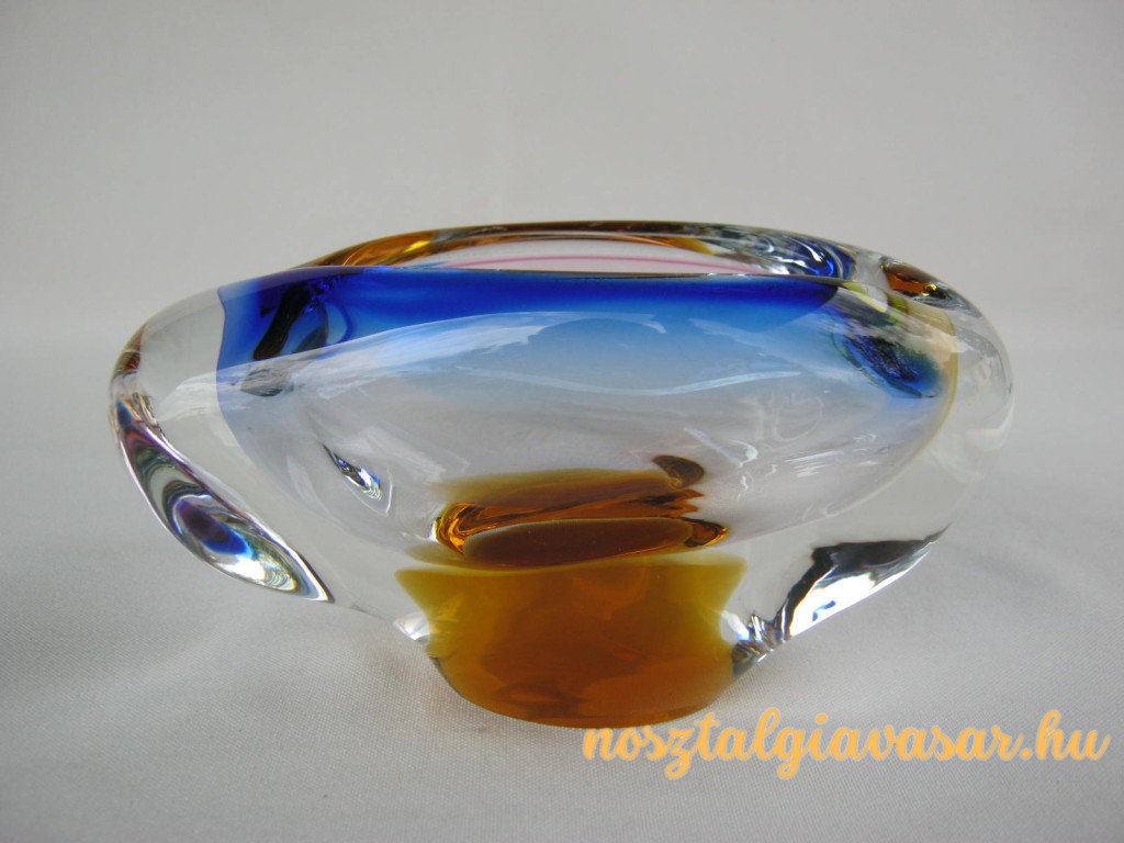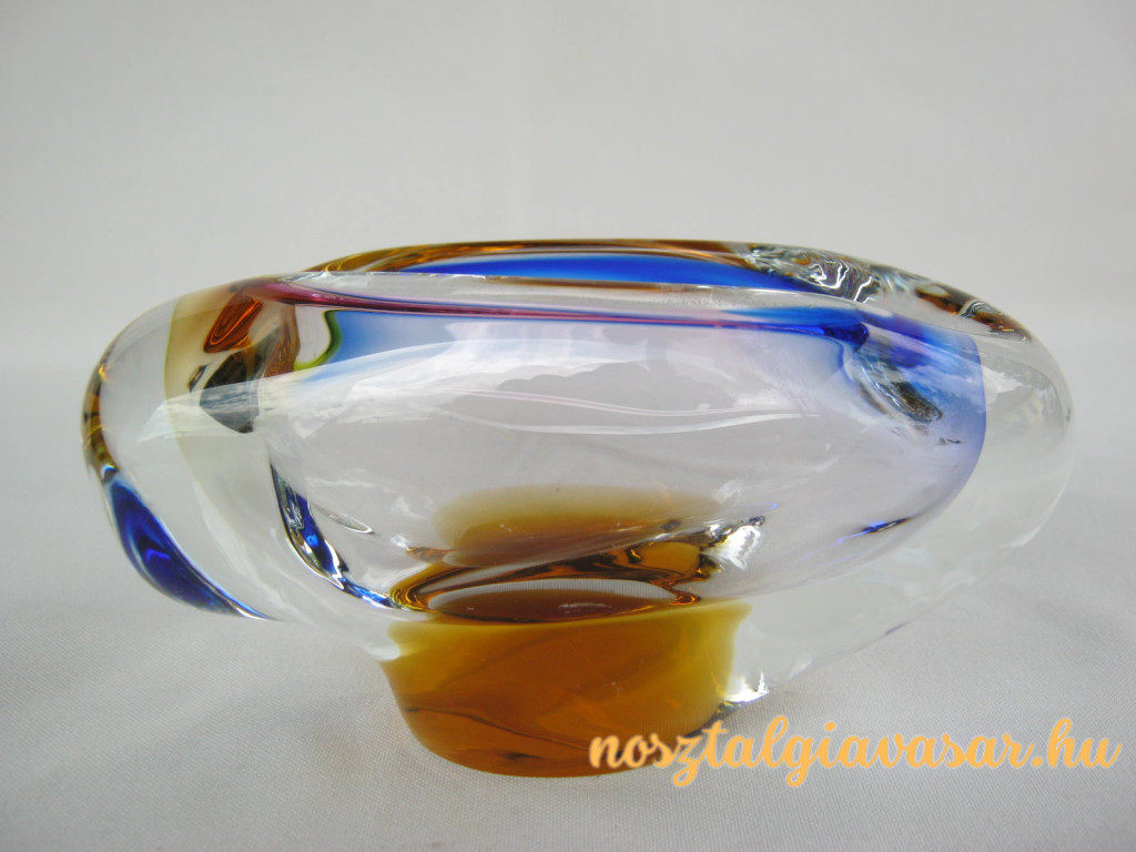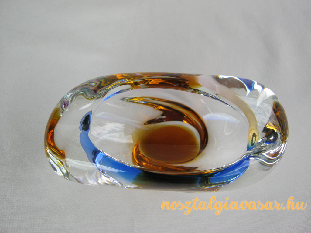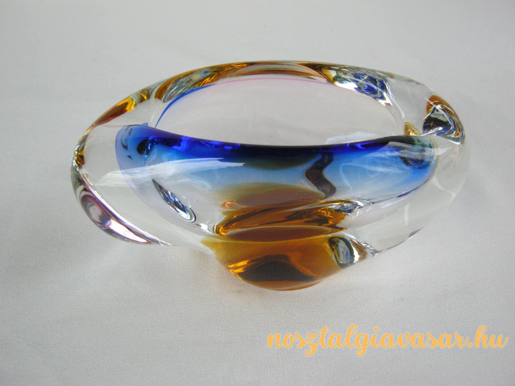 Üveg hamutál, hamutartó színes mintázattal Jelzés: nincs Hossz: 14 cm Szélesség: 6,5 cm Magasság: 7,5 cm Állapota: képek szerinti, korának megfelelő Rendelhető mennyiség: 1 db
